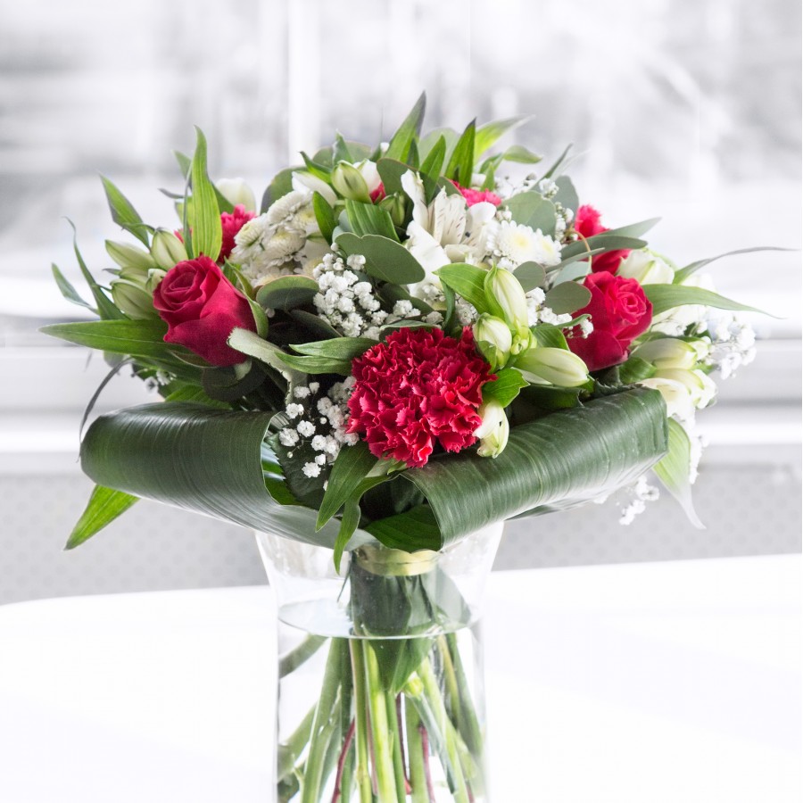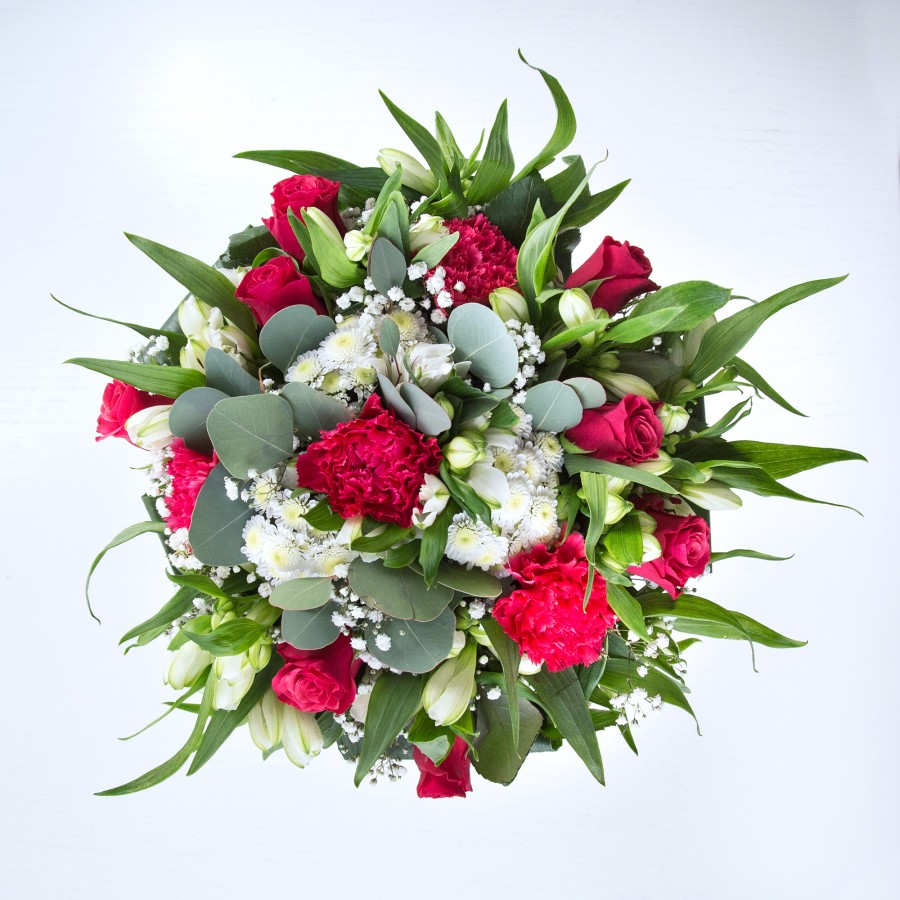 Discover the vibrant elegance of our Vibrant Elegance Bouquet. This unique arrangement combines sweet white chrysanthemums and gypsophila with luxurious red roses and carnations, beautifully arranged with white alstroemeria and aspidistra leaves.
