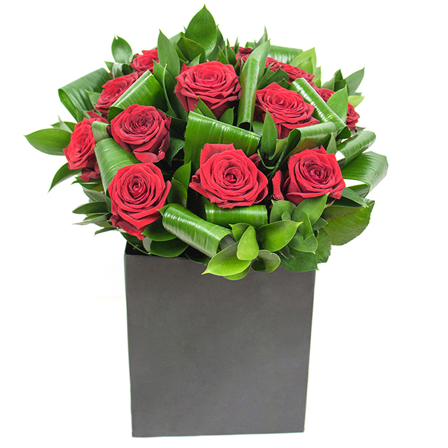 Experience the timeless beauty and unique elegance of our exquisite bouquet. This stunning arrangement features vibrant red roses, lush aspidistra leaves, and delicate ruscus, creating a harmonious blend of colors and textures that will enhance any space.