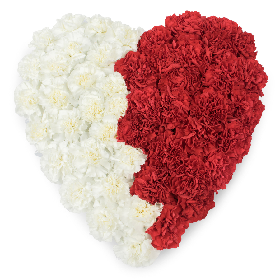 Embodying both elegance and passion, our heart-shaped bouquet features a classic combination of white and red carnations. Each bloom is hand-selected for its freshness and beauty, resulting in a breathtaking display.